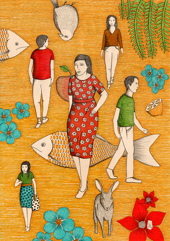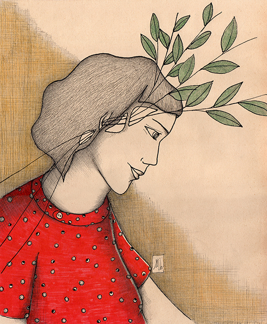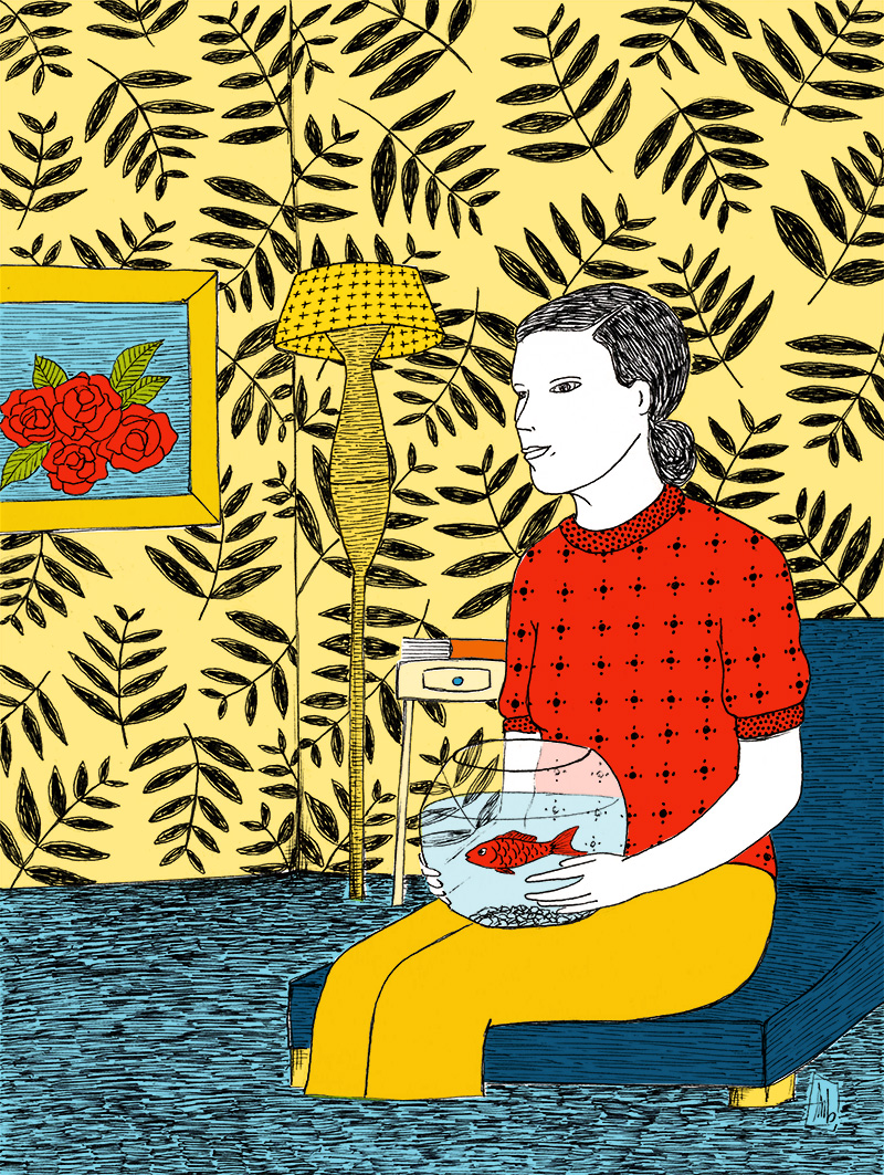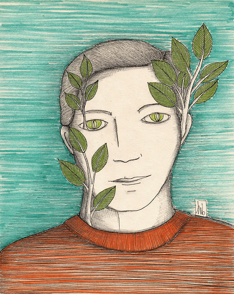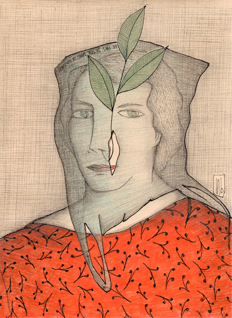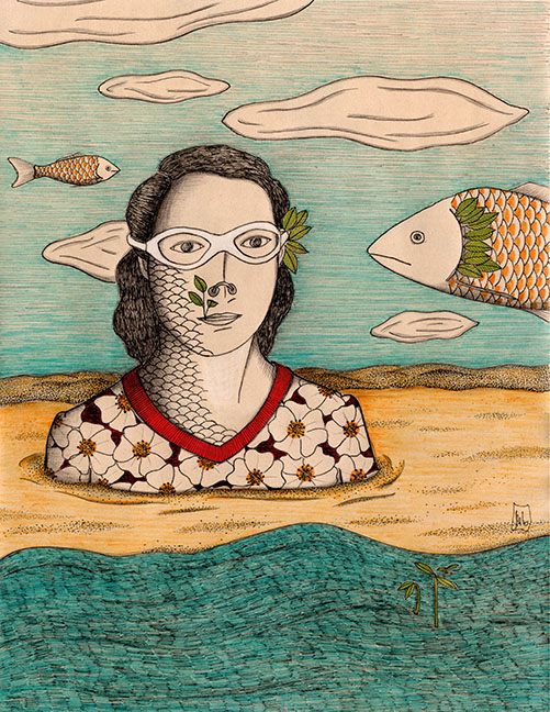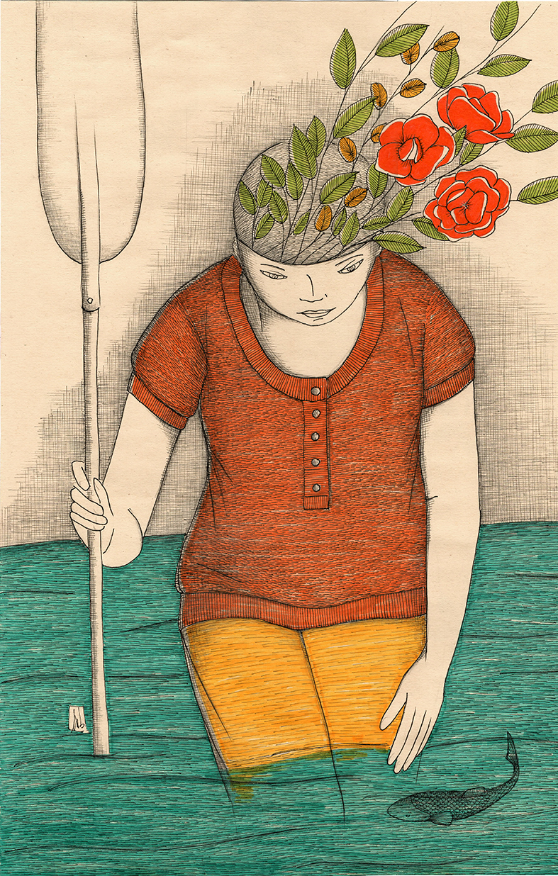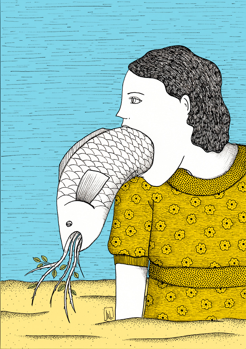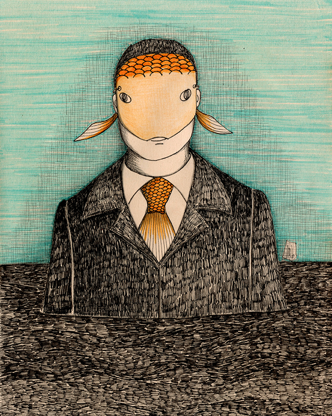 Portrait au poisson aux orties . 21 par 27,7 cm